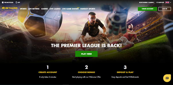 If you take your eyes below a bit, you will be able to observe a king-sized banner which tells “The Premier League is Back!”. Football player that is playing with his ball is designed on this banner. Under it, you will see a green button “Play Here” and 3 steps for starting an instant play.