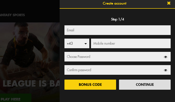 Also, you will need to come up with a strong and (unnecessary) creative password. The password will need to be confirmed one more time. If you have any bonus codes, use them by clicking on the button “Bonus Code”. Once all lines are fulfilled, it becomes possible to click on the “Continue” button and get to the other 3 steps which are all intuitive and do not require to be explained at all. After the registration is passed, you can login.